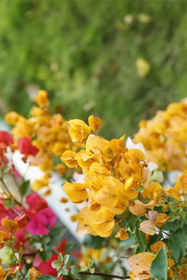 玫红、艳粉、明黄的花朵缀满枝头